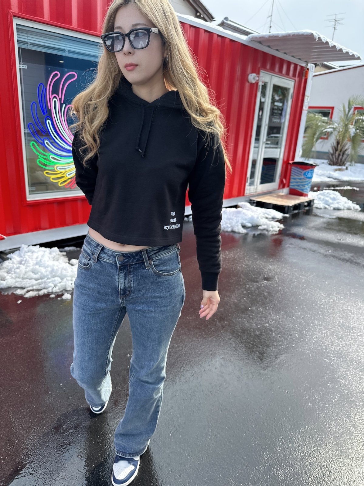 まず、このフーディーの最大のポイントは、そのユニークなリメイクデザインです。一点一点丁寧に仕立てられており、一般的な製品とは一線を画す個性的な雰囲気を醸し出しています。短丈のシルエットは、トレンドを押さえながらも、スタイルに変化をつけることで、コーディネートにアクセントを加えます。ハイウエストのボトムスやミニスカートとの相性も抜群で、脚長効果を演出します。