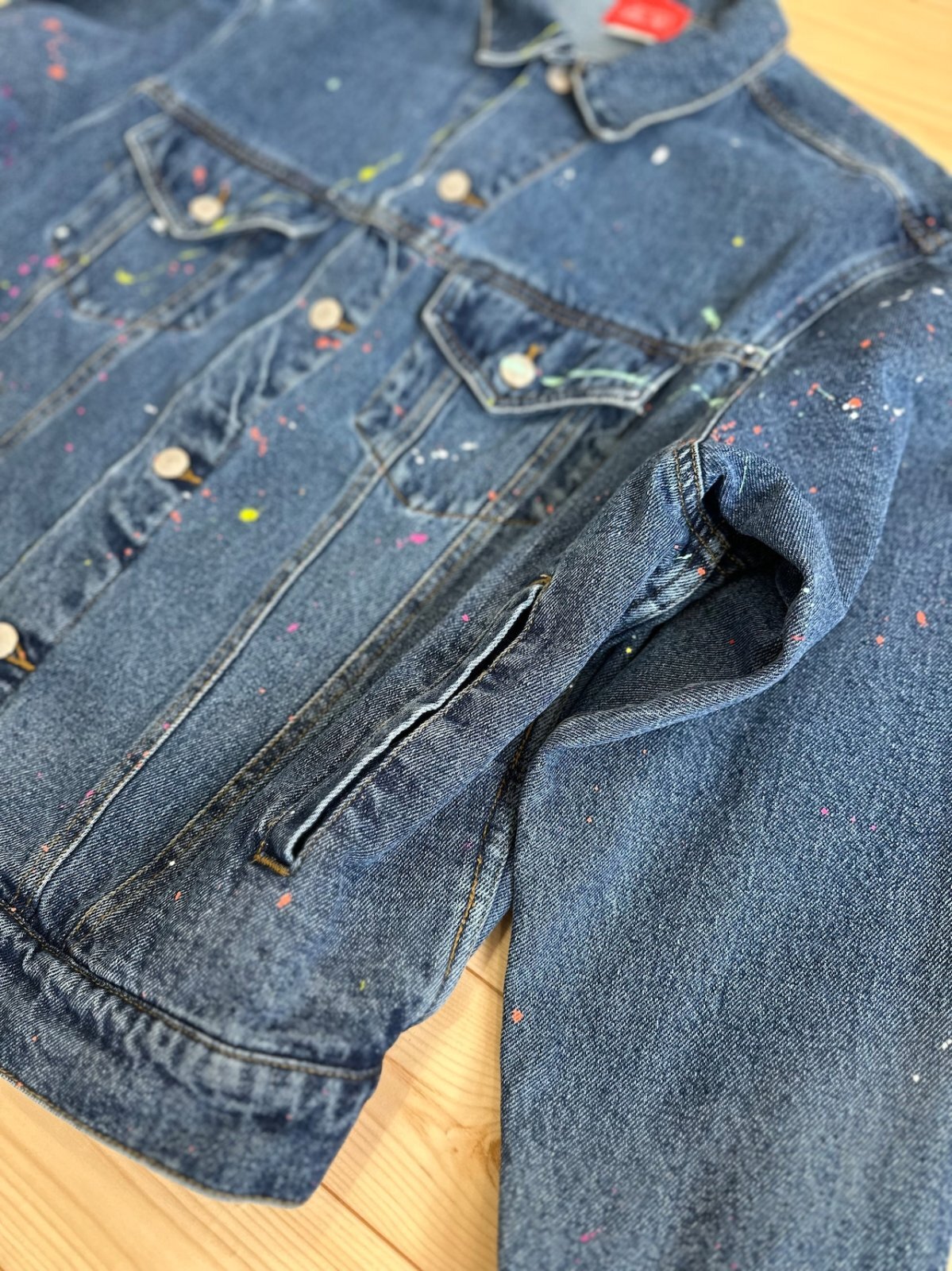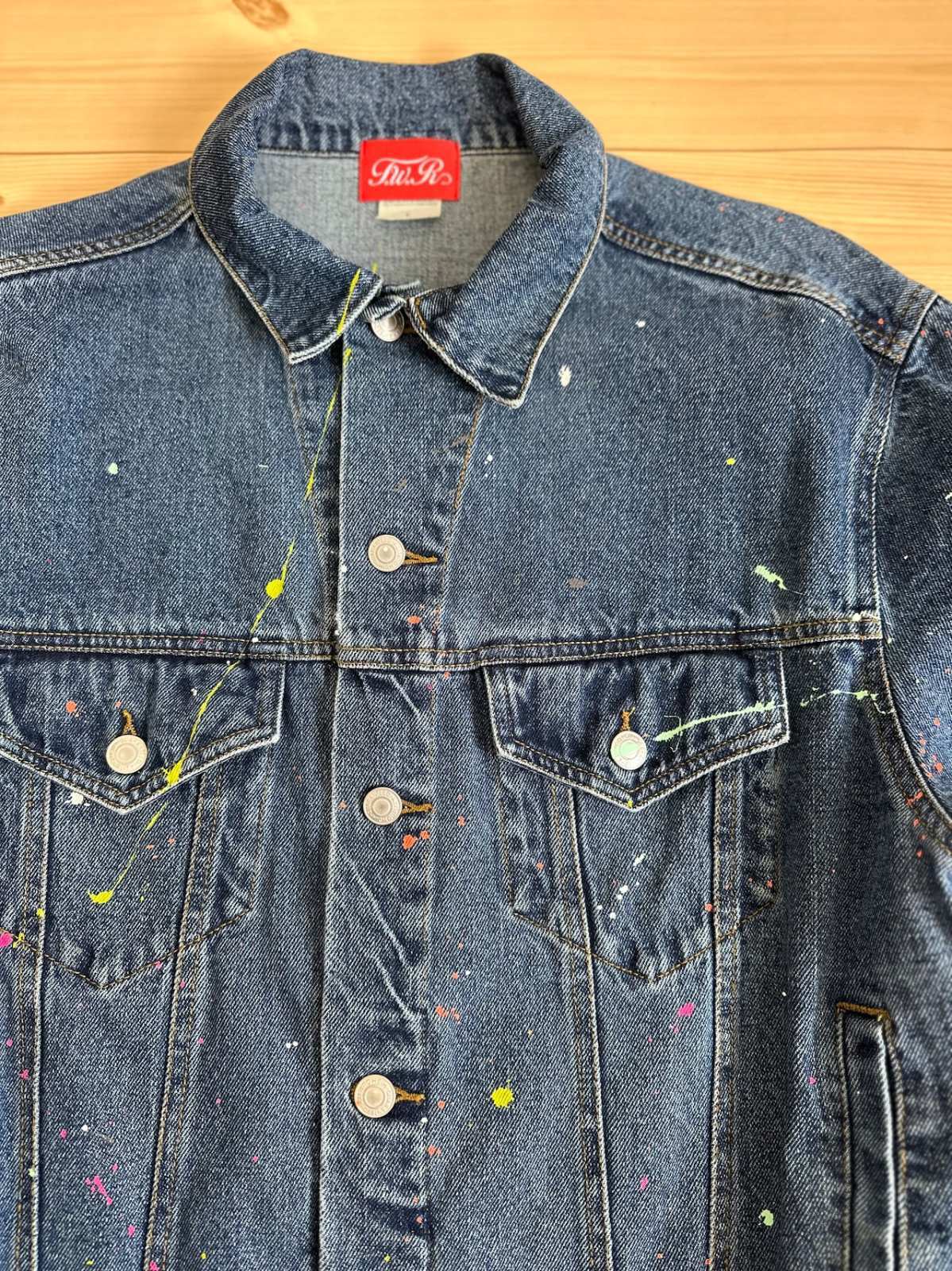 TWRオリジナルのデニムジャケットに、ペイントスプラッシュ加工を施し、アート感溢れる一枚に仕上げました。