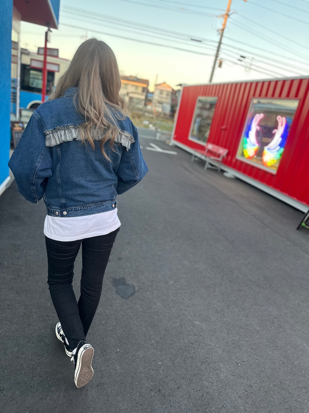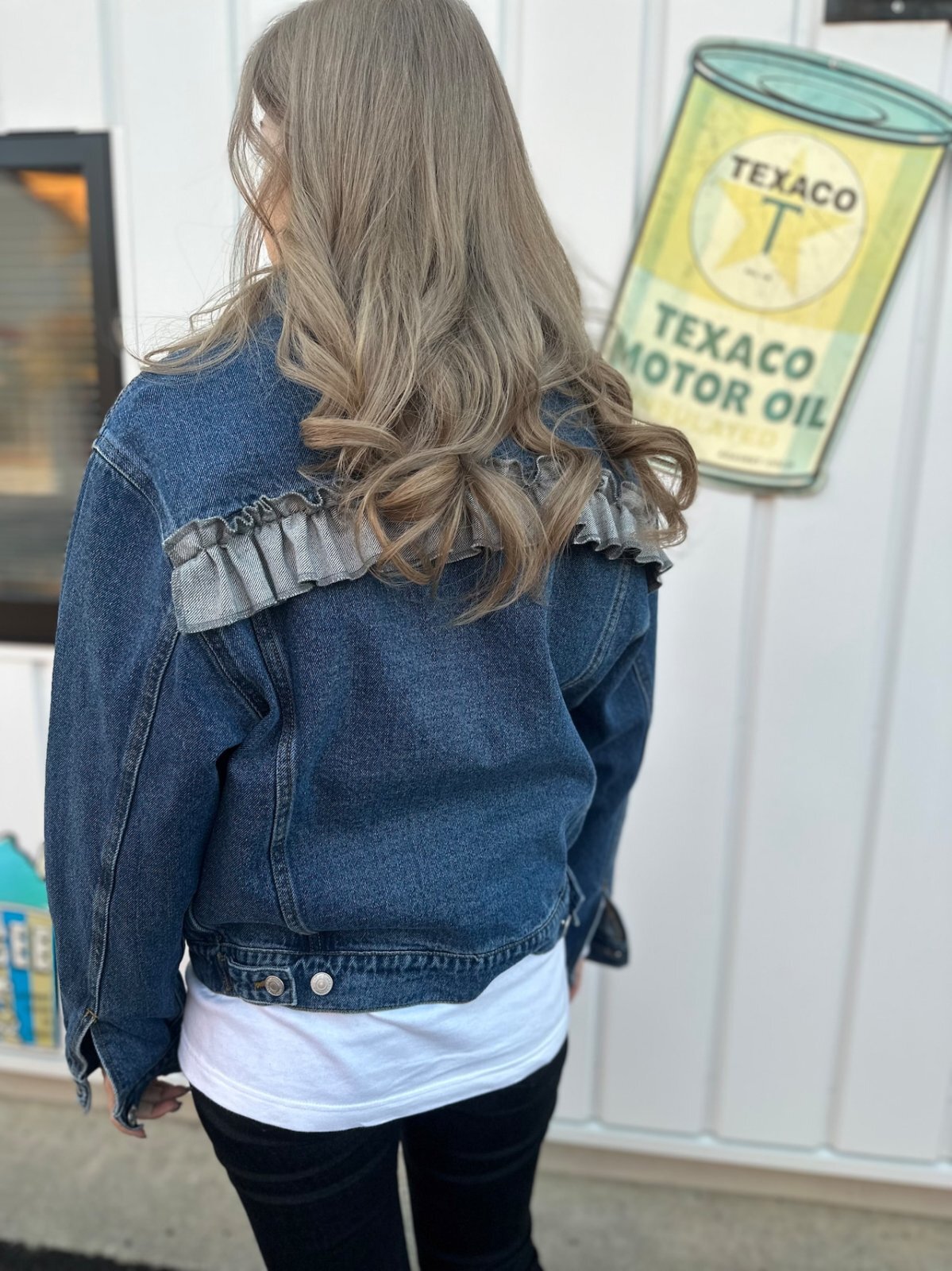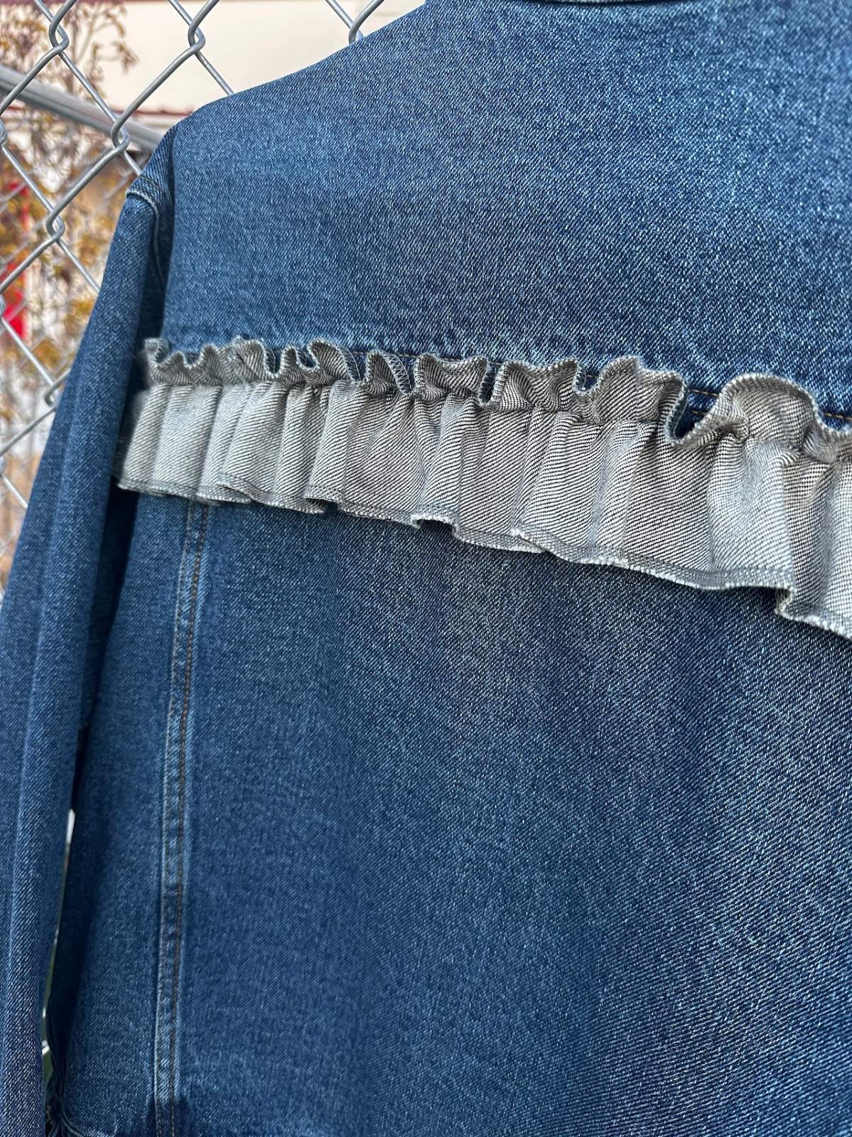シンプルなデニムジャケットに、個性をプラスするためのフリルデザインを背中にあしらいました。カジュアルさにちょっとしたエレガンスを加え、いつものコーディネートがぐっとオシャレに。
