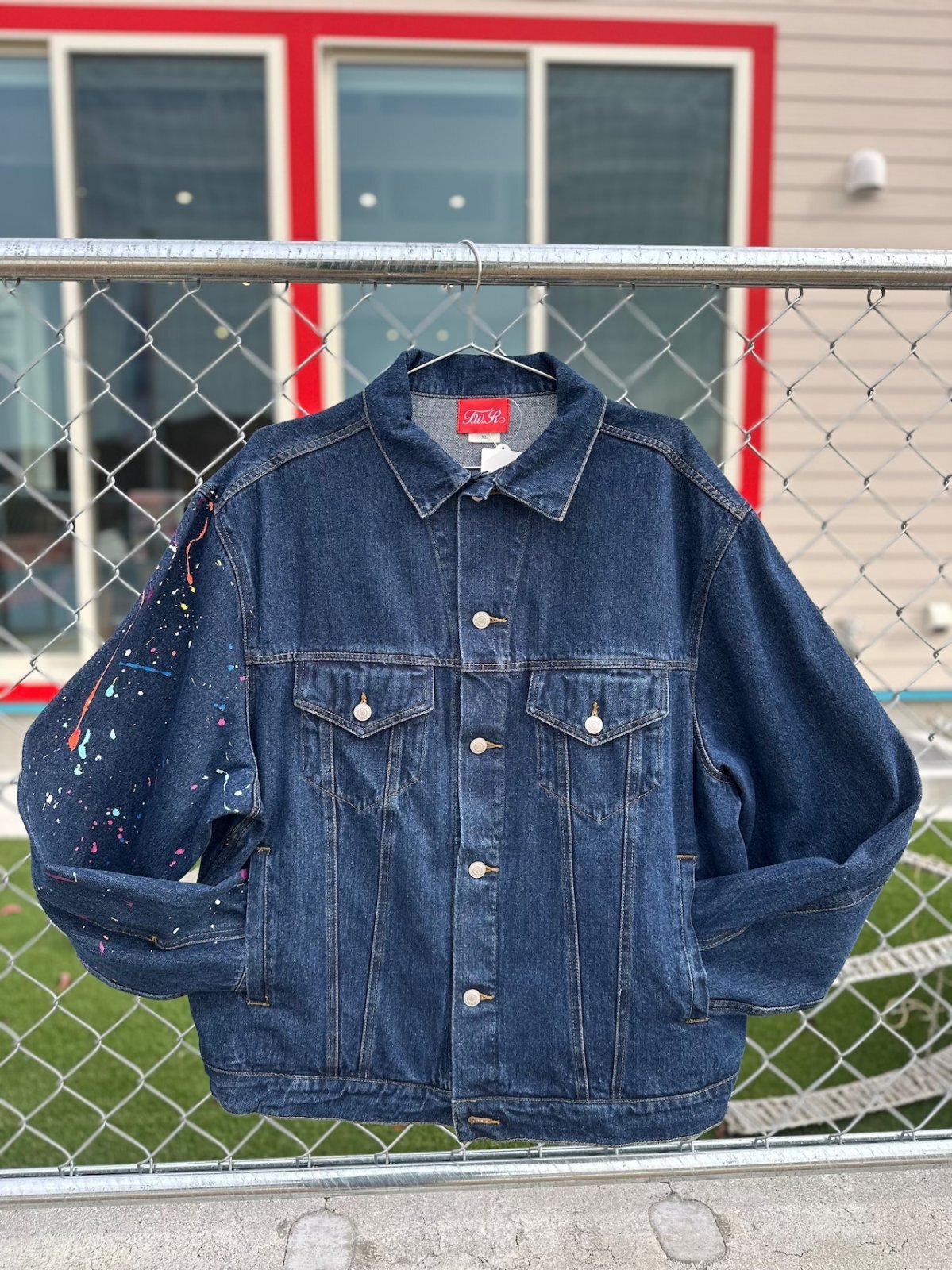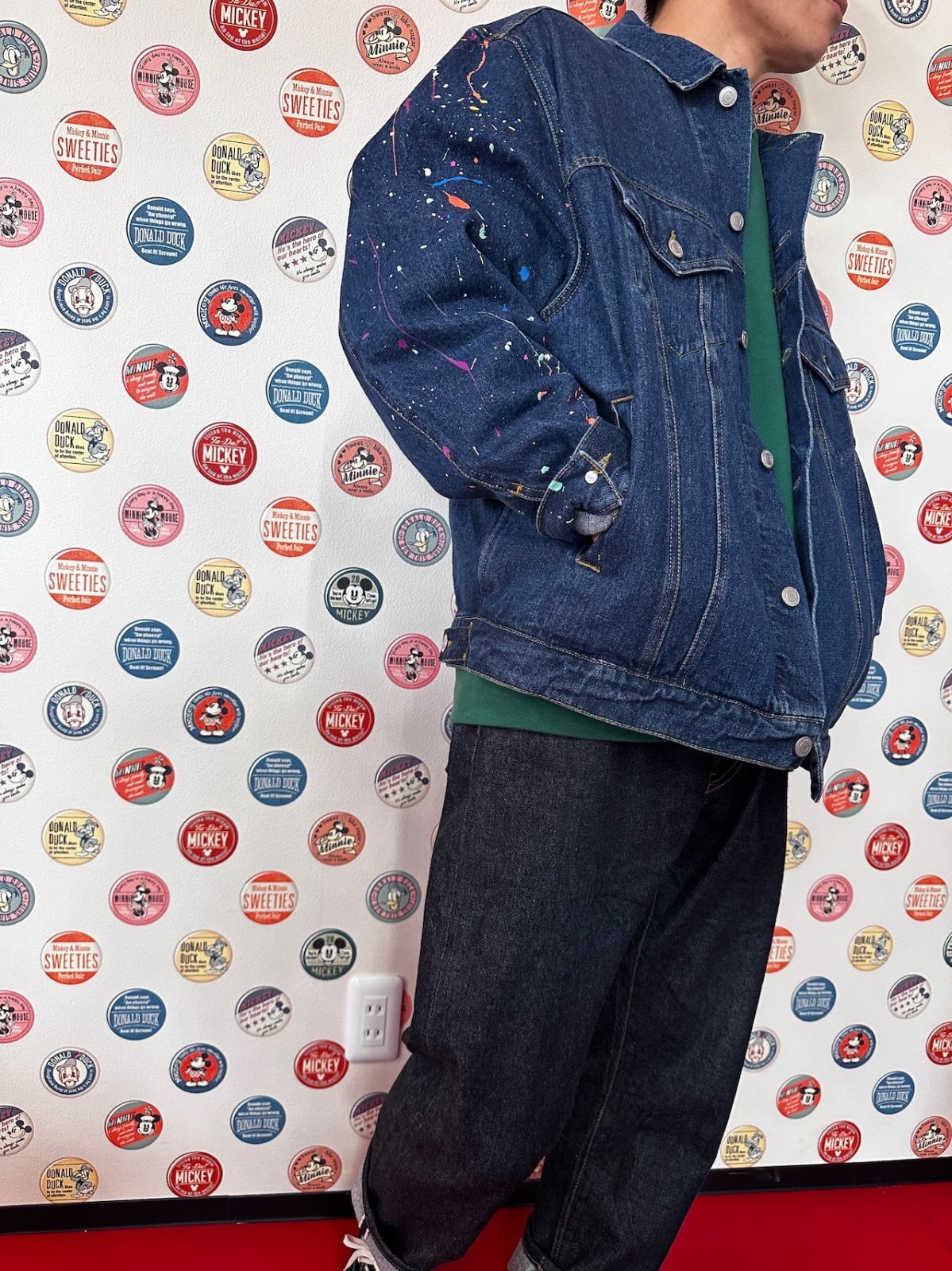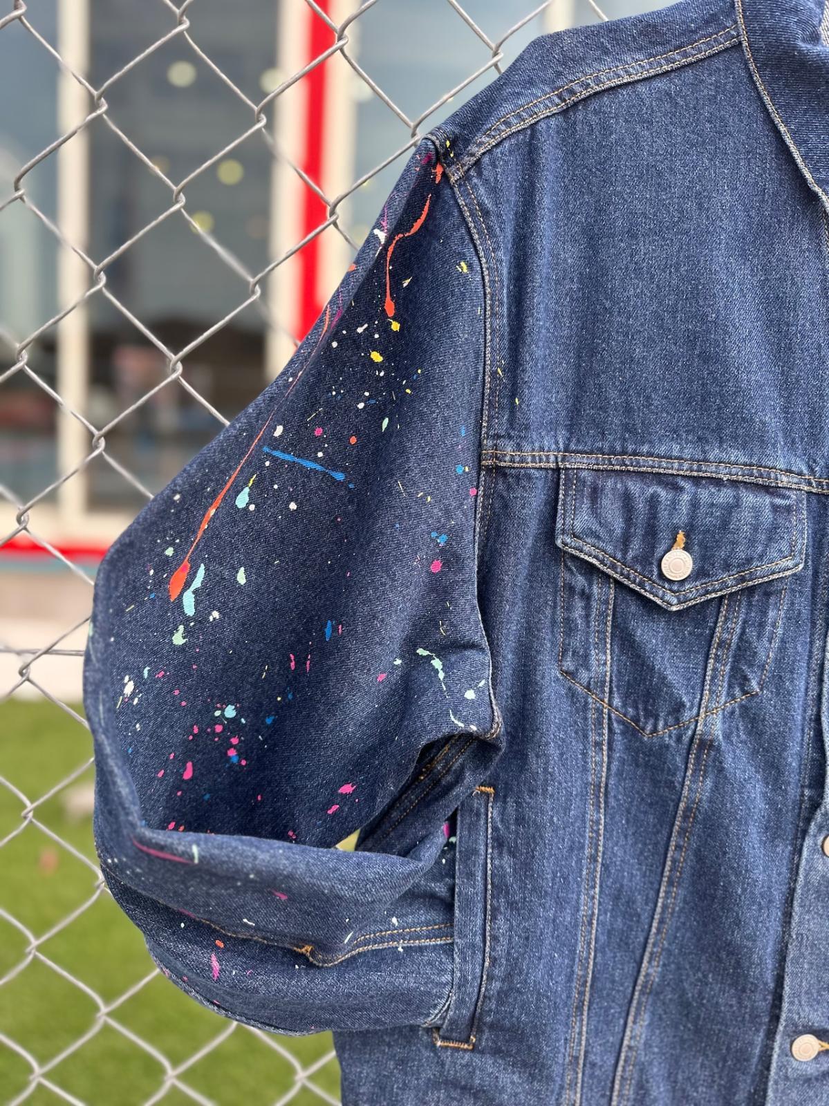 オーバーサイズのデニムジャケットの右腕部分にスプラッシュ加工を施しました。