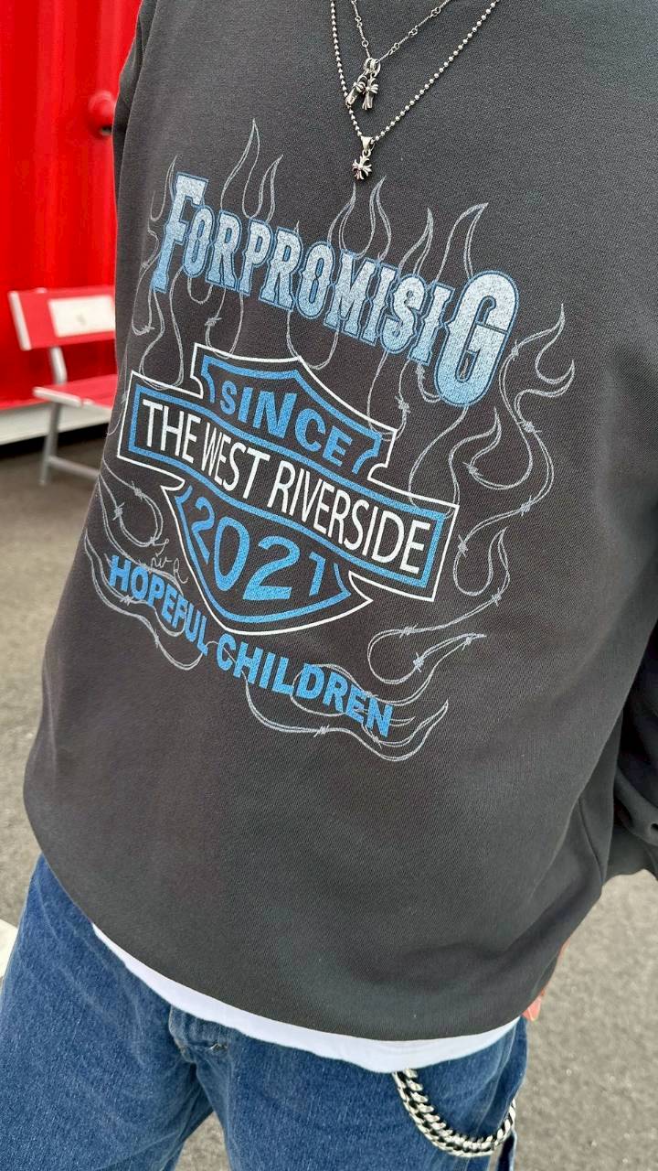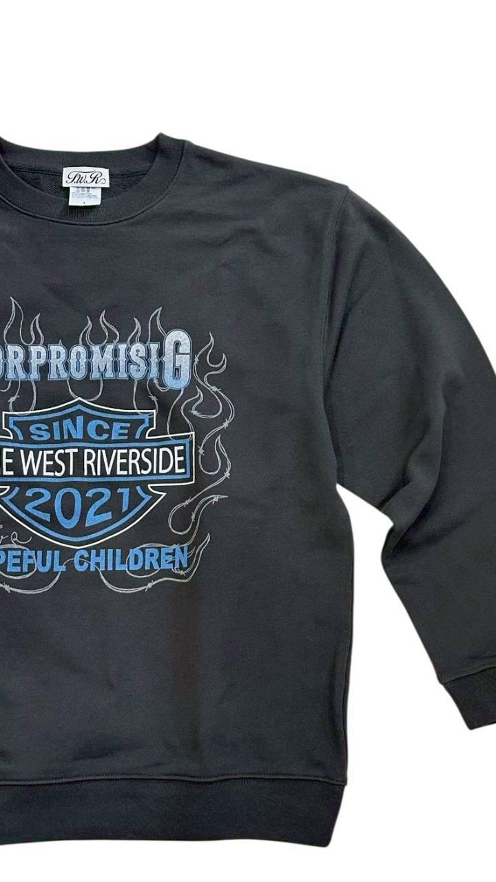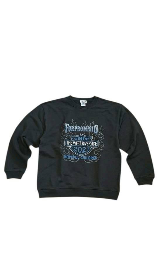 フロントに大胆に配されたファイヤーパターンとシールドロゴが目を引く、主役級のクルーネックスウェット!