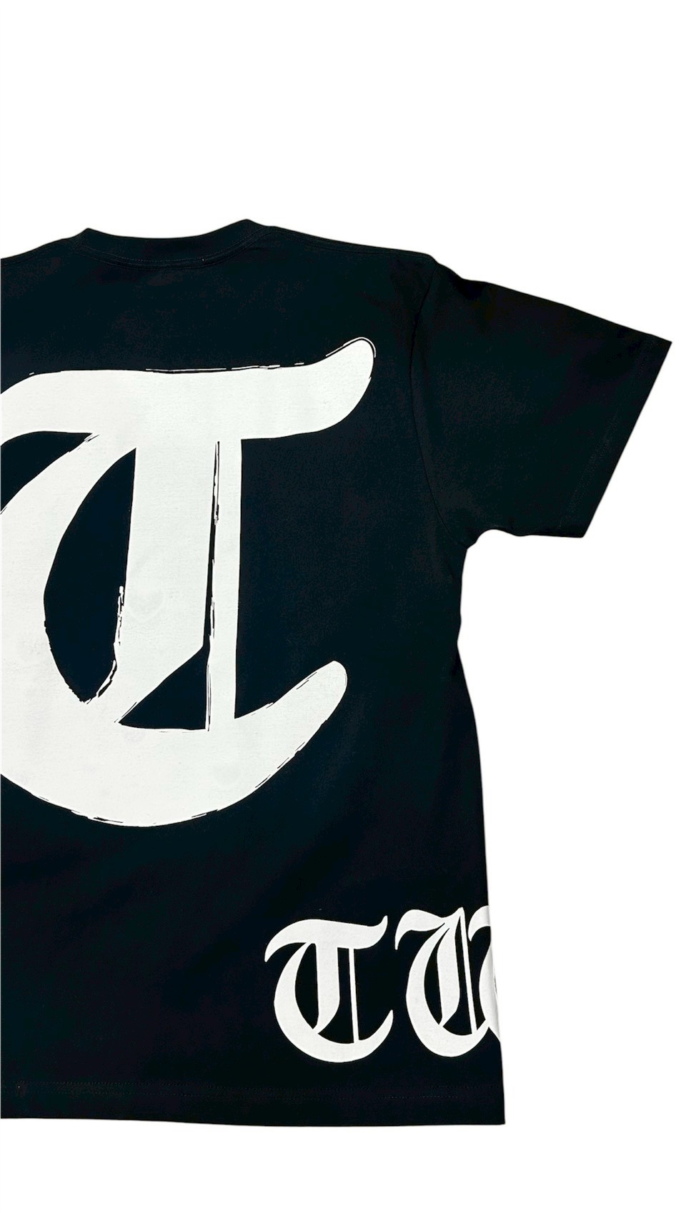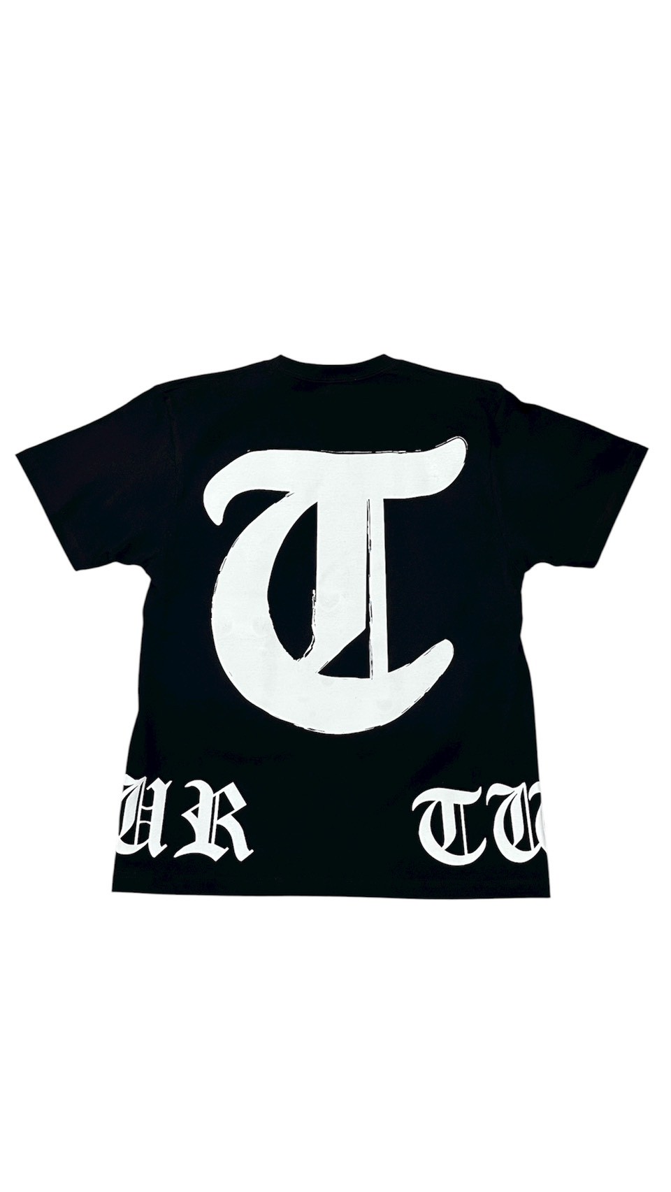 バックに大胆に配されたオールドイングリッシュ(花文字)の「T」が目を引く、ストリートライクな半袖Tシャツ。