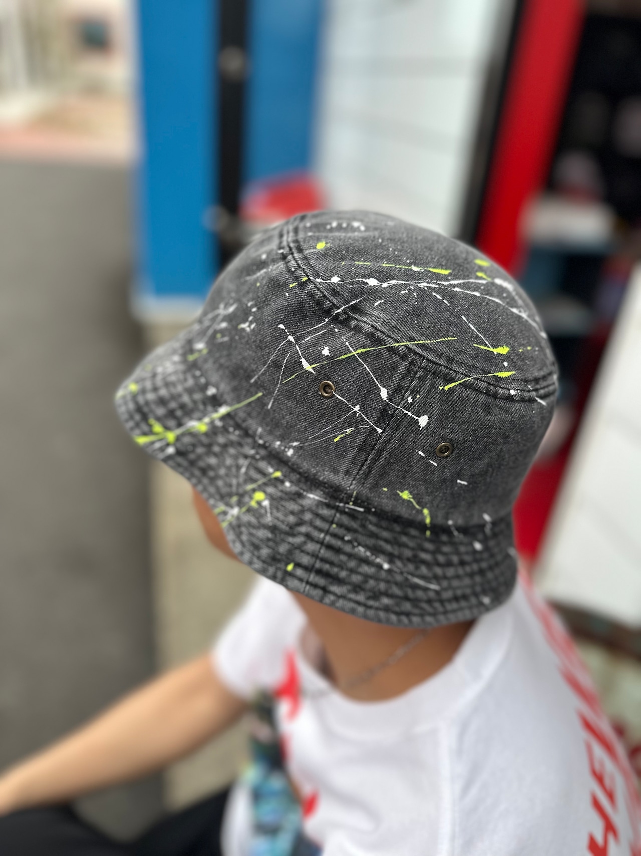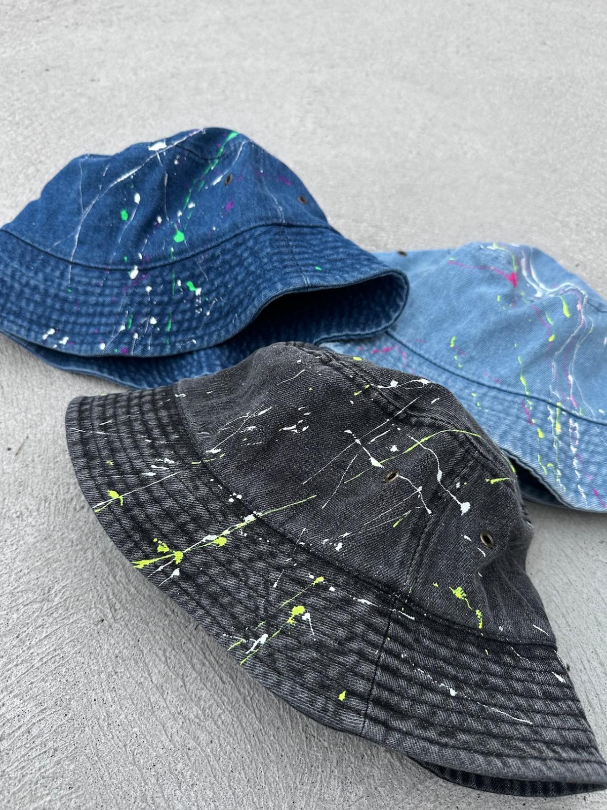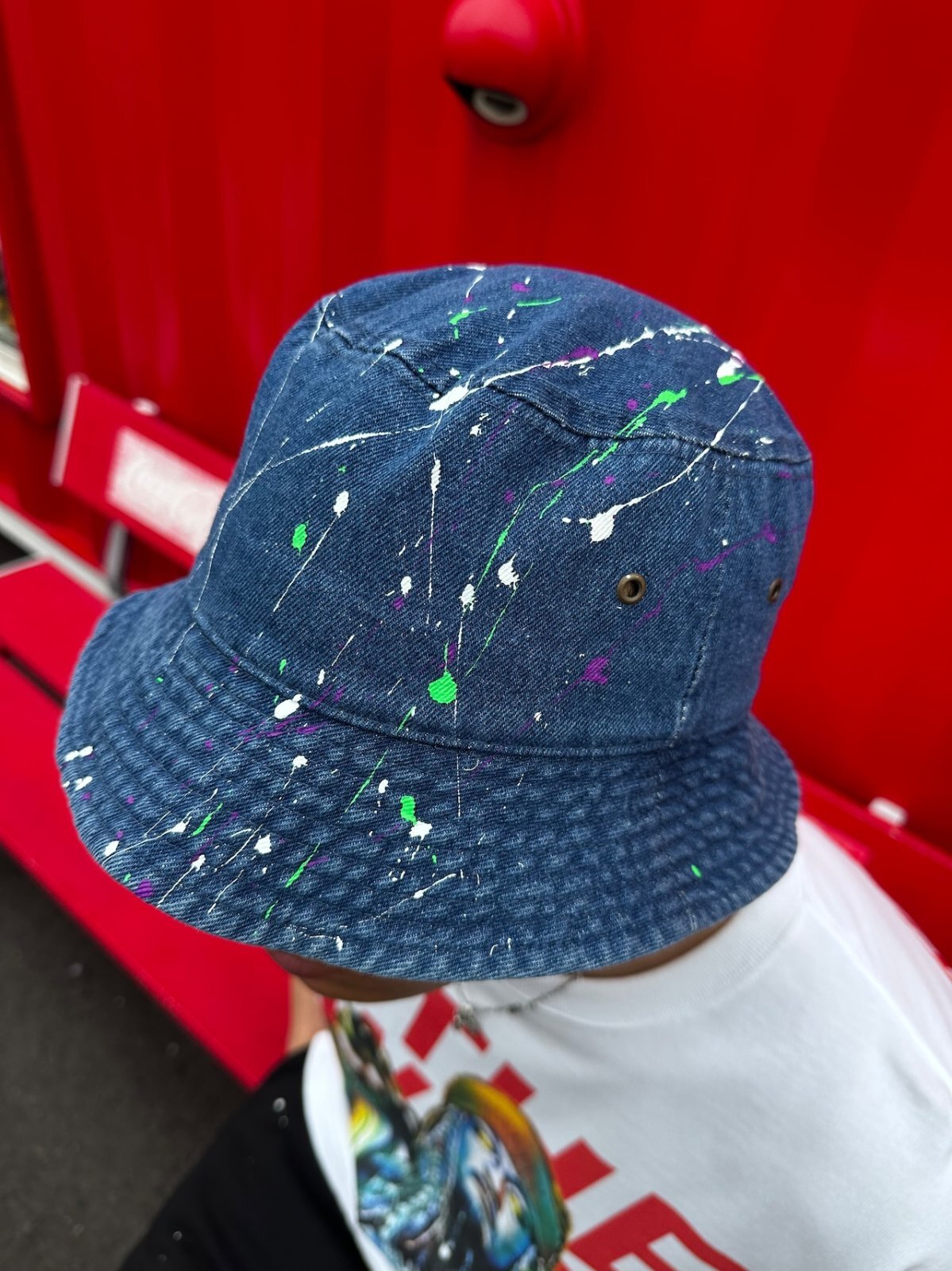 アートな雰囲気漂うペイントスプラッシュデザインのデニムバケットハット。ヴィンテージ感のあるデニム生地に大胆なペイントを施し、ストリートスタイルやカジュアルコーデに個性をプラス。